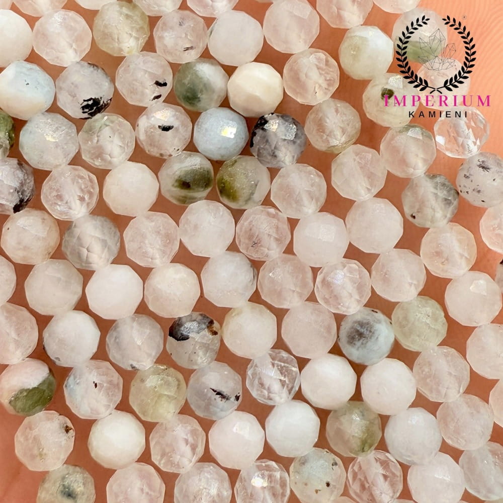 Fasetowane kulki kamienia księżycowego z naturalnymi inkluzjami turmalinu o średnicy ok. 4 mm – subtelnie opalizujące, z wyraźnymi czarnymi akcentami nadającymi całości charakteru. Idealne do biżuterii minimalistycznej, eleganckiej i projektów o wyrazistym, energicznym stylu.