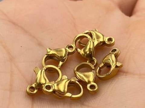 Zapięcie jubilerskie typu karabińczyk ze stali nierdzewnej PVD w kolorze złotym o długości 9 mm – trwałe, estetyczne i wygodne zapięcie do delikatnych bransoletek i naszyjników.