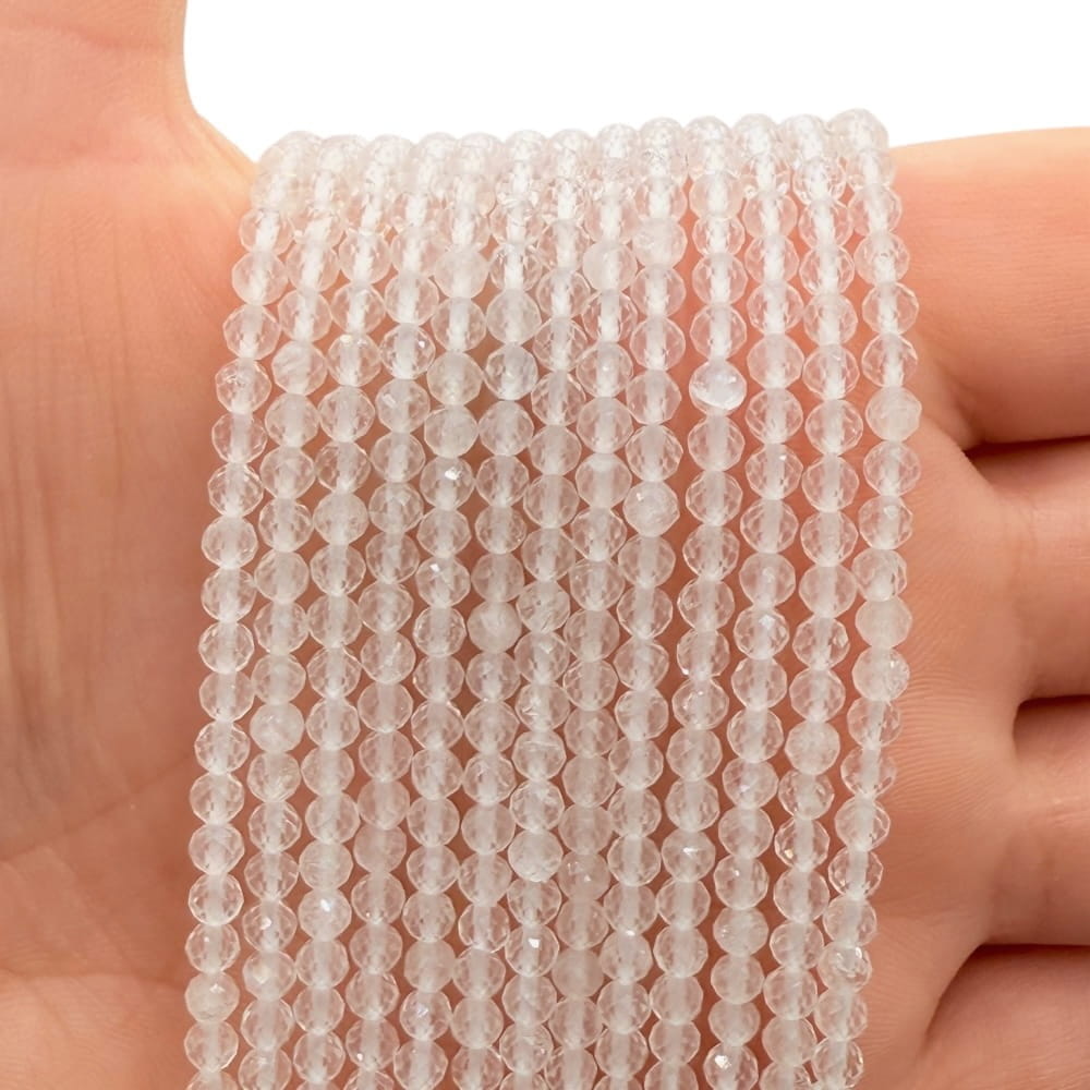 Kryształ górski to kamień naturalny znany ze swojej czystości, przejrzystości i zdolności do odbijania światła. W formie fasetowanej kulki o średnicy ok. 3 mm subtelnie mieni się w świetle, nadając biżuterii lekkości i elegancji. Każdy sznur jest unikatowy – naturalne inkluzje i różnice w przejrzystości sprawiają, że każdy projekt staje się wyjątkowy.