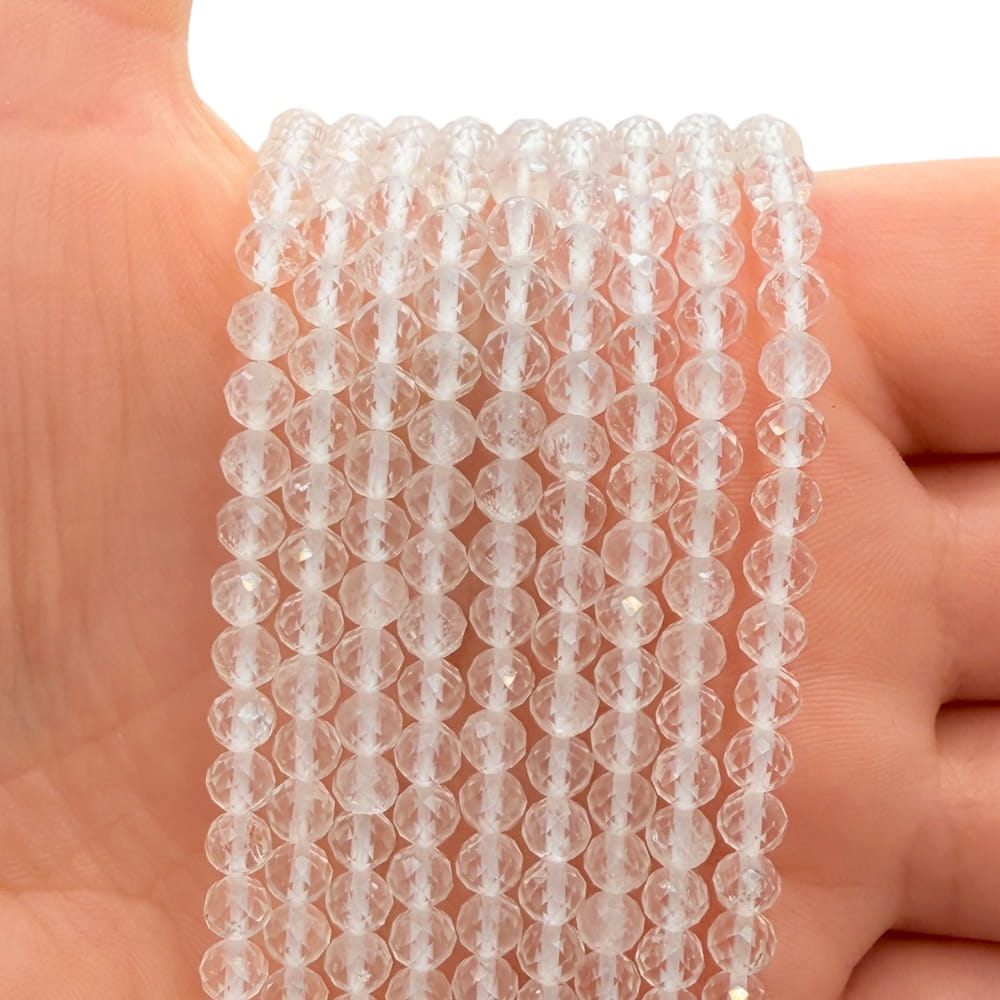 Fasetowane kulki kryształu górskiego o średnicy ok. 4 mm – kamień o wysokiej przejrzystości i czystej, szklistej strukturze. Szlif fasetowy intensywnie odbija światło, podkreślając naturalny blask minerału. Idealny do eleganckiej, minimalistycznej biżuterii handmade oraz uniwersalnych projektów łączonych z innymi kamieniami naturalnymi.