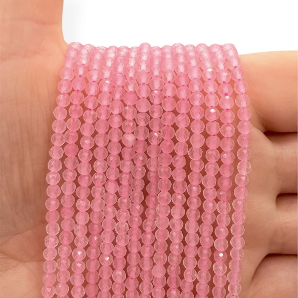 Fasetowane kulki kwarcu różowego o średnicy ok. 3 mm – delikatne, jasnoróżowe z subtelnym połyskiem. Idealne do biżuterii minimalistycznej, eleganckiej i projektów o subtelnym, romantycznym charakterze.