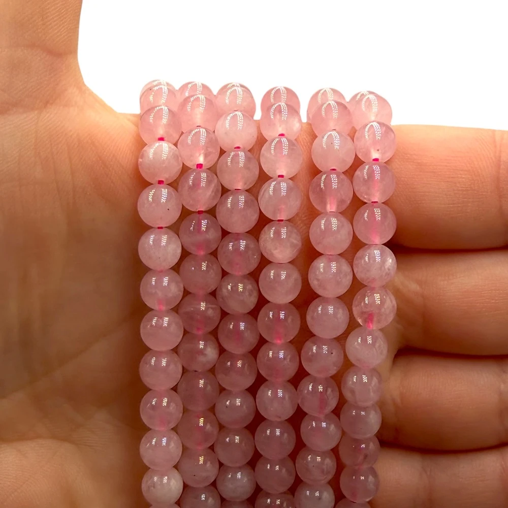 Kwarc różowy to kamień o łagodnej, pastelowej barwie symbolizujący miłość, spokój i harmonię serca. Gładkie kulki o średnicy ok. 6 mm pięknie odbijają światło, podkreślając subtelny połysk kamienia. Każda kulka jest wyjątkowa – drobne inkluzje sprawiają, że każdy sznur ma unikalny charakter.