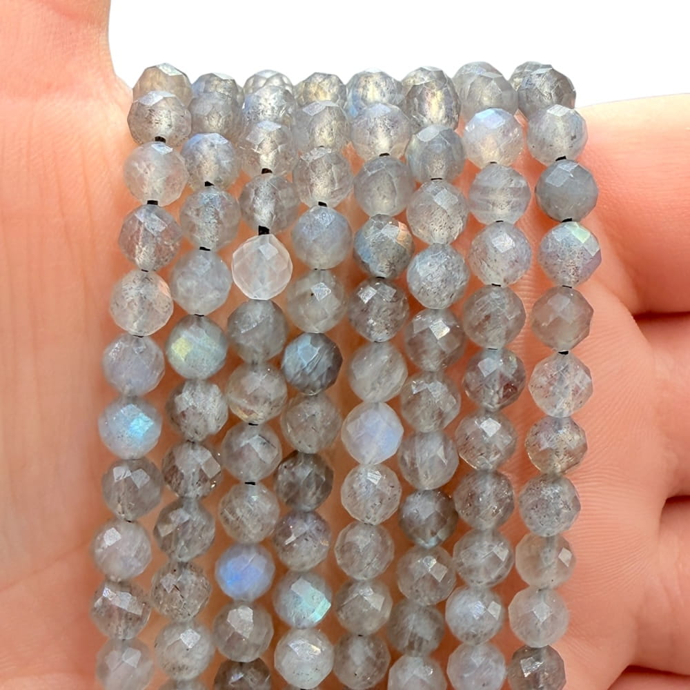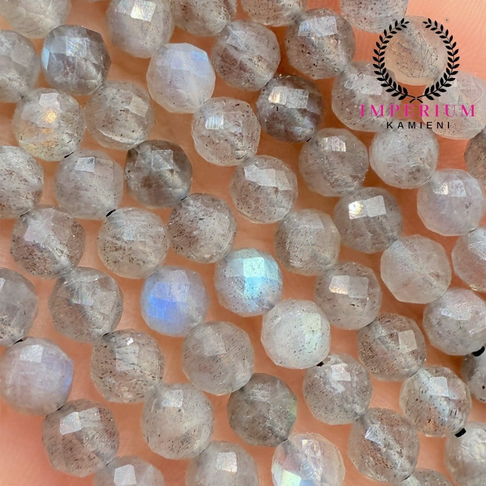 Fasetowane kulki labradorytu o średnicy ok. 5 mm – subtelnie szare z opalizującymi refleksami w niebiesko-zielonych tonach, idealne do biżuterii eleganckiej, mistycznej i nowoczesnej.