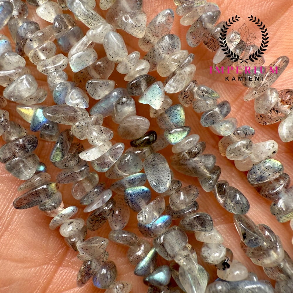 Gładka sieczka z jasnego labradorytu o długości 80 cm i wielkości pastylek ok. 3×5 mm – doskonała do subtelnej, pełnej magii biżuterii.