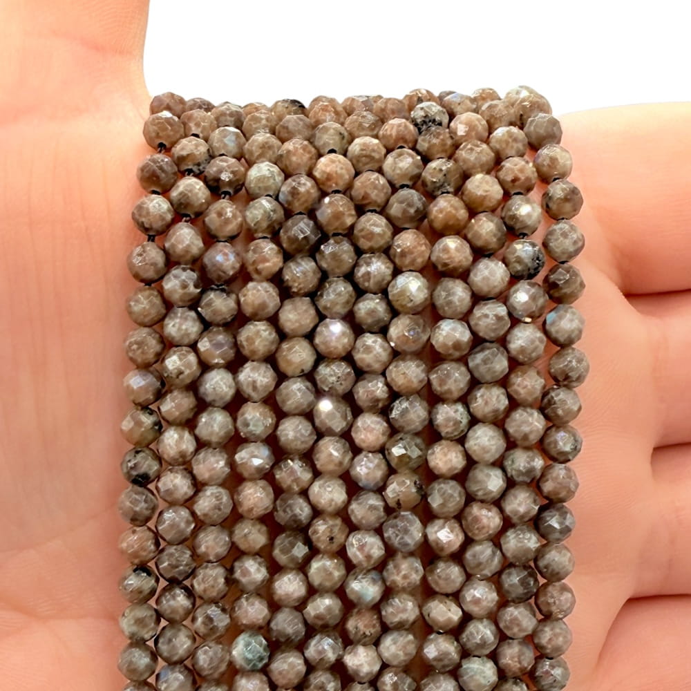 Fasetowane kulki labradorytu kawowego o średnicy ok. 4 mm – głębokie, ciepłe brązowo-szare tony z subtelnym, opalizującym połyskiem. Idealne do biżuterii minimalistycznej, eleganckiej i projektów o naturalnym, energetycznym charakterze.