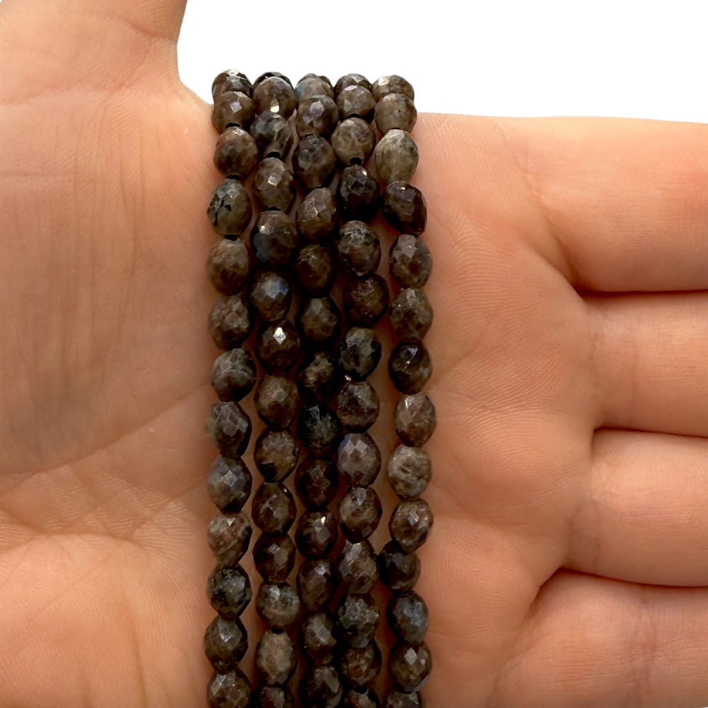 Fasetowane oliwki z labradorytu kawowego o wymiarach ok. 5×7 mm – ciepły brąz z subtelną, złocistą iryzacją.