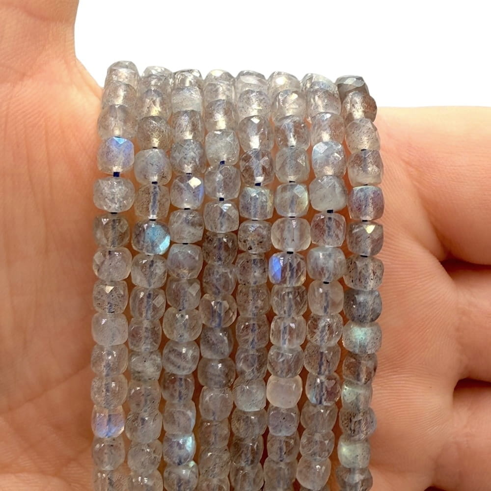 Fasetowane kostki Labradorytu o wymiarach ok. 4×4 mm – kamień o charakterystycznej iryzacji w odcieniach niebieskiego, zieleni i złota. Idealne do biżuterii minimalistycznej, nowoczesnej i projektów o mistycznym, eleganckim charakterze.