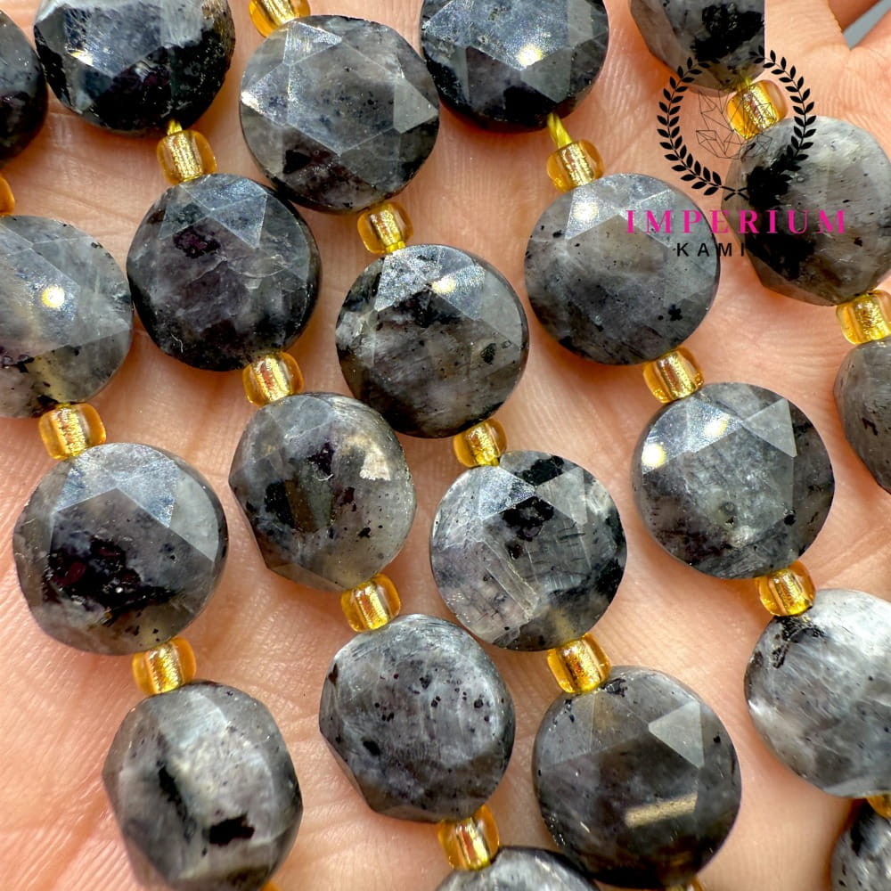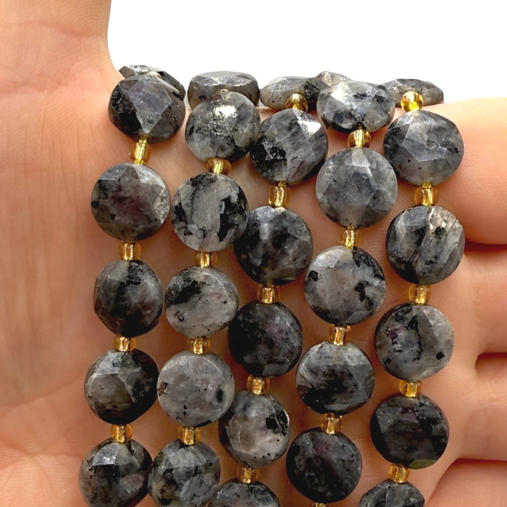 Larvikit to ciemna skała magmowa z północnych wybrzeży Norwegii, ceniona za swoje subtelne, niebiesko-srebrzyste refleksy (schiller). Nasze pastylki mają wymiary około 10×6 mm i zostały precyzyjnie oszlifowane w formę fasetowanej pastylki, co podkreśla ich naturalny połysk i głębię barwy. Dzięki unikatowym efektom optycznym larvikit doda każdej biżuterii charakteru i tajemniczego uroku.