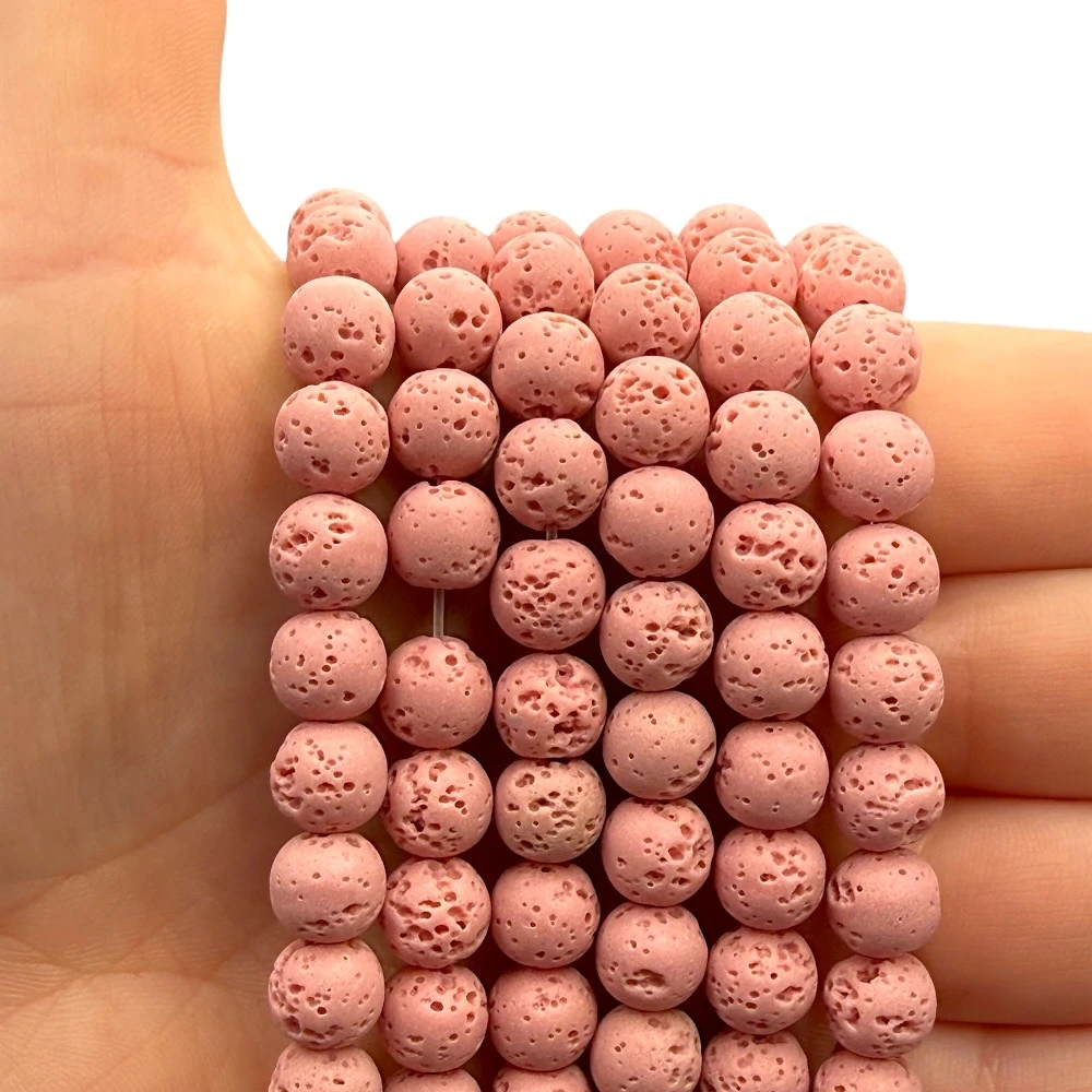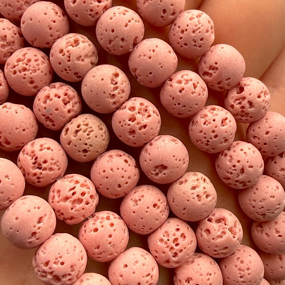 Różowe elementy z naturalnej lawy w kształcie kulki gładkiej o wymiarach ok. 6 mm — delikatny, pastelowy odcień oraz porowata struktura nadają biżuterii subtelny, nowoczesny charakter. Idealne do projektów boho, romantycznych kompozycji oraz eleganckich form handmade.
