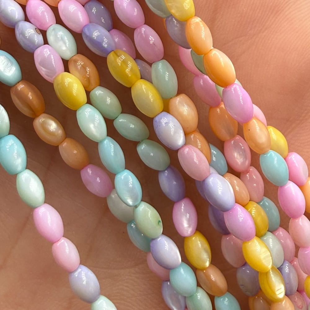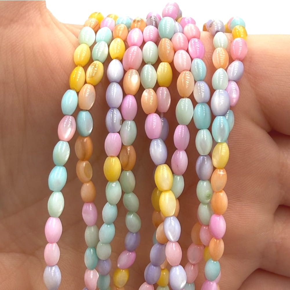 Gładkie elementy z pastelowej masy perłowej w kształcie ryżu o wymiarach ok. 3×5 mm – subtelnie połyskujące, z delikatnymi przejściami pastelowych barw. Idealne do lekkiej, dziewczęcej i romantycznej biżuterii.