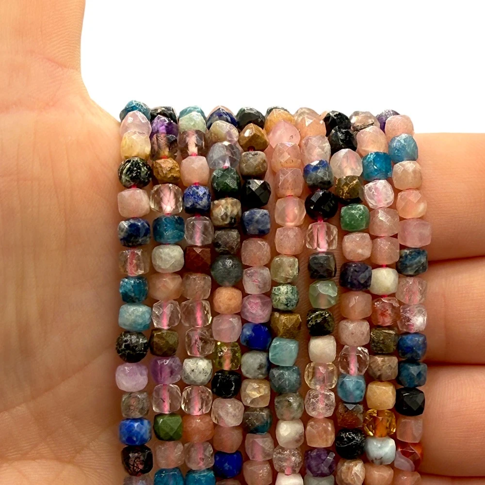 Fasetowane kostki mix kamieni o średnicy ok. 4x4 mm – różnorodne kolory i naturalne inkluzje, idealne do biżuterii kolorowej, kreatywnej i energetyzującej.