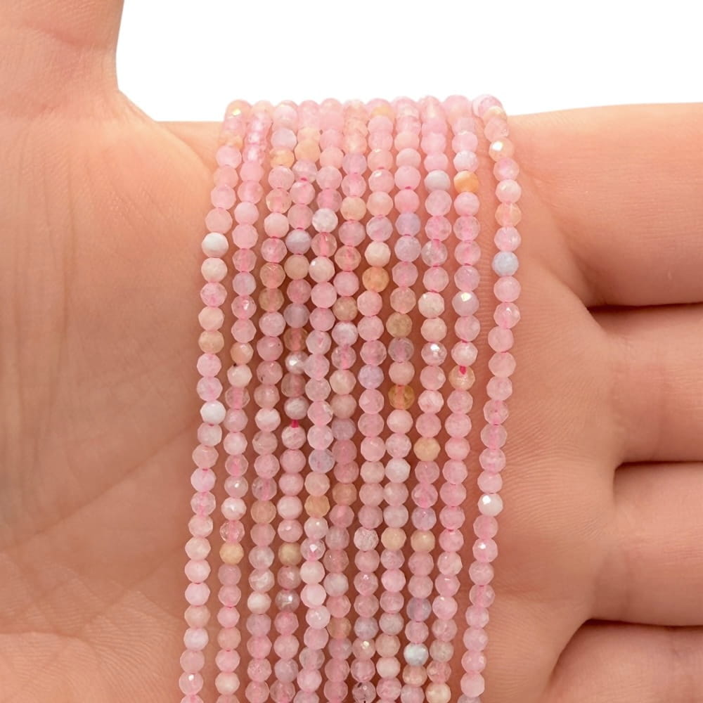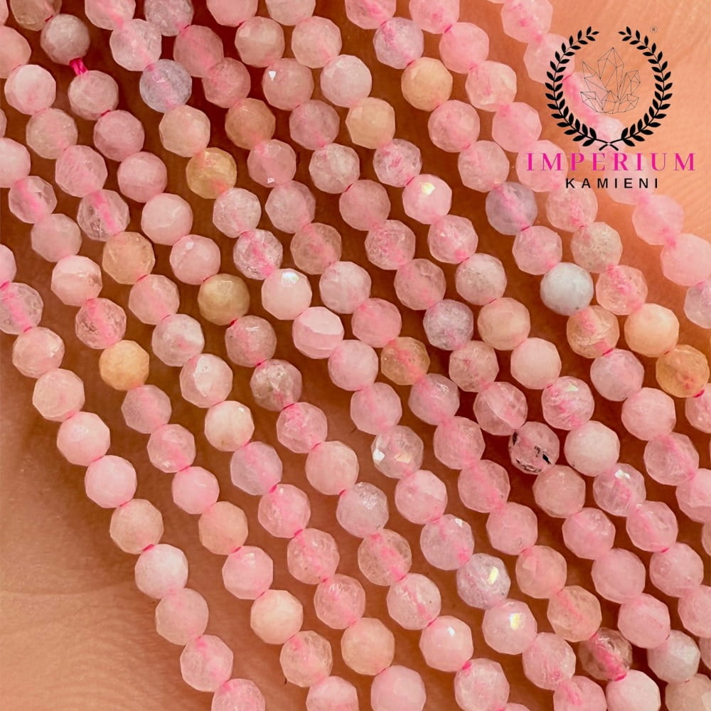 Fasetowane kulki morganitu o średnicy ok. 2 mm – delikatne, pastelowo-różowe z subtelnym połyskiem. Idealne do biżuterii minimalistycznej, eleganckiej i projektów o subtelnym, romantycznym i harmonijnym charakterze.