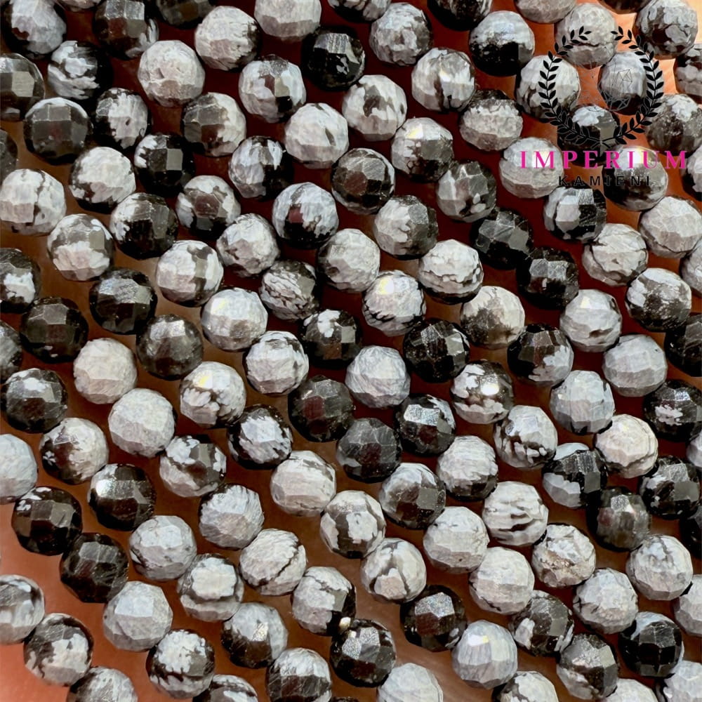Fasetowane kulki obsydianu granitowego o średnicy ok. 3 mm – kamień o głębokiej czerni z charakterystycznymi, jasnoszarymi i srebrzystymi drobinkami tworzącymi efekt „pieprzu i soli”. Szlif fasetowy podkreśla kontrast kolorystyczny oraz nadaje koralikom elegancki, nowoczesny połysk. Idealny do delikatnej, minimalistycznej biżuterii handmade oraz projektów o wyrazistym, ochronnym charakterze.