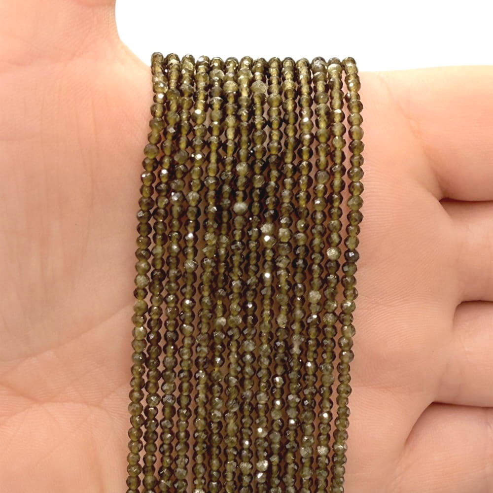 Fasetowane kulki obsydianu złotego o średnicy ok. 2 mm – głęboka czerń z delikatnymi złotymi refleksami dodaje biżuterii subtelnego blasku i elegancji. Idealne do drobnej, minimalistycznej biżuterii i energetycznych akcentów.