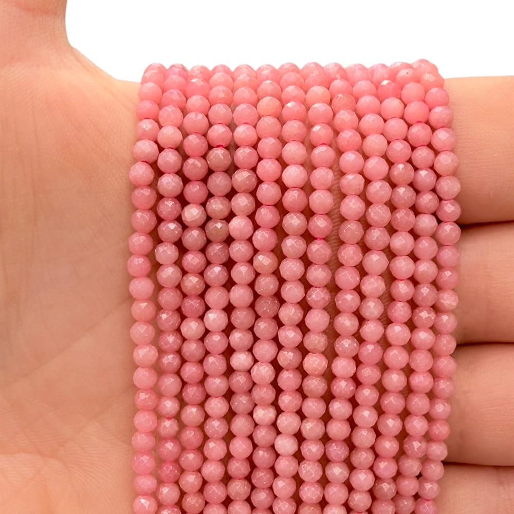 Opal różowy to kamień o delikatnej, mlecznej różowej poświacie, symbolizujący miłość, wrażliwość i spokój emocjonalny. Fasetowane kulki o średnicy ok. 3 mm pięknie odbijają światło, nadając projektom biżuteryjnym subtelny blask i elegancki charakter.