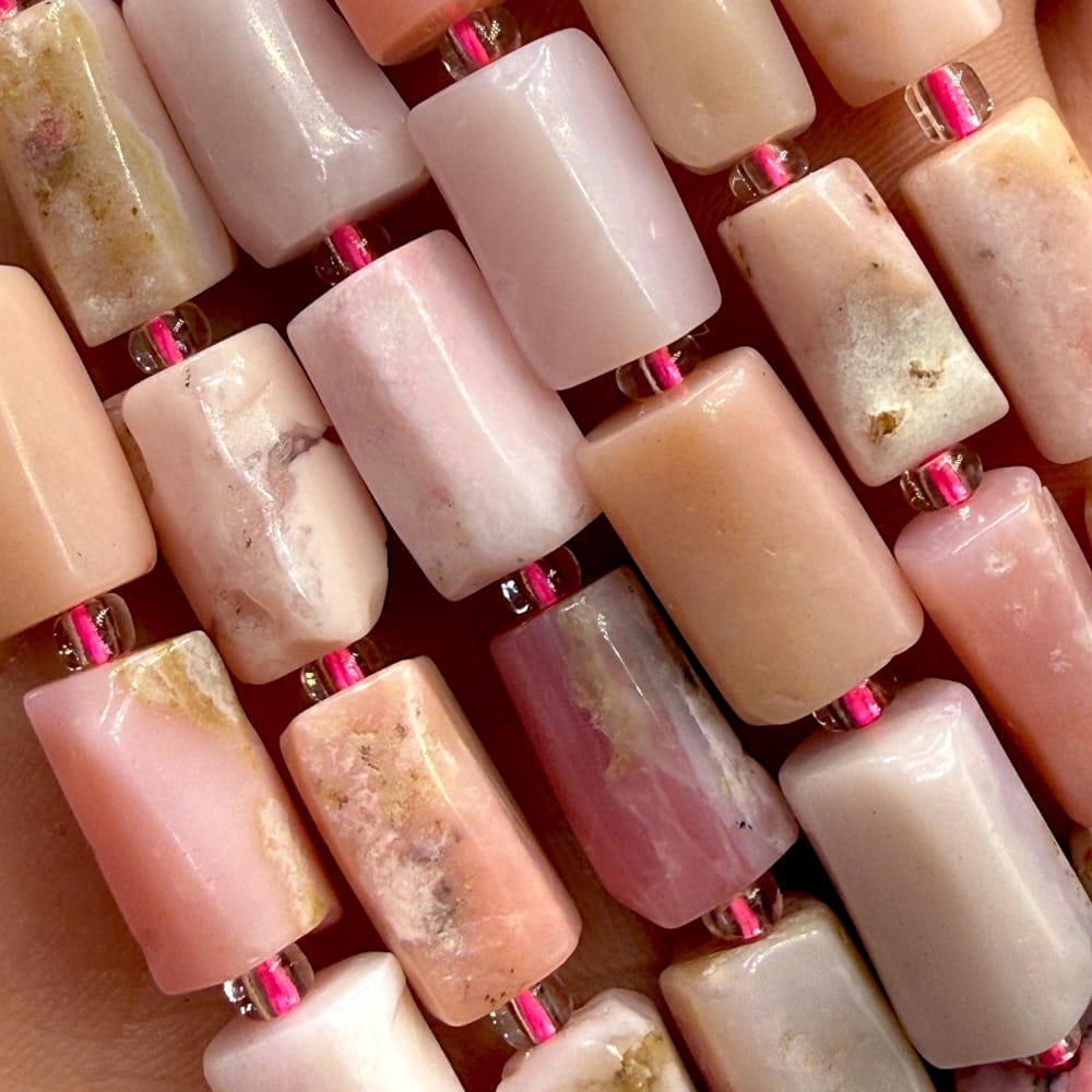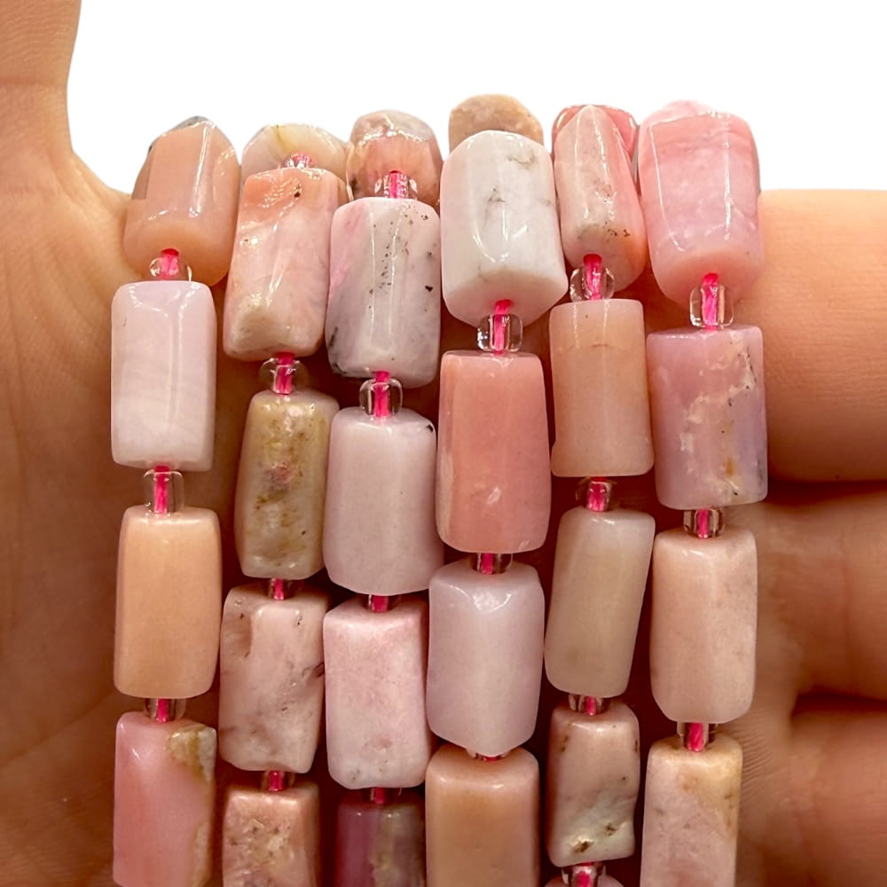 Gładkie walce z opalu różowego, ok. 7x11 mm – delikatny pastelowy róż o subtelnym, mlecznym blasku.