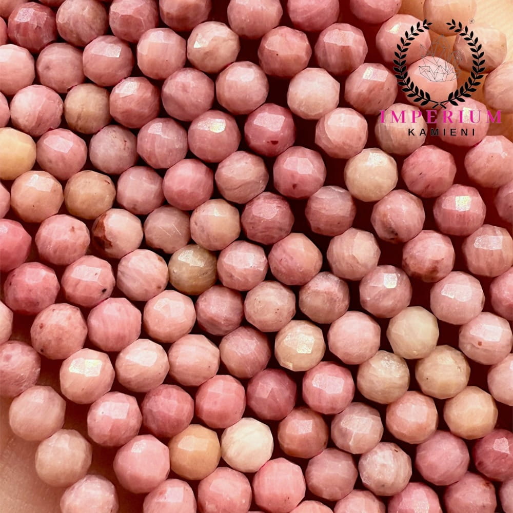 Rodonit to kamień o ciepłym, różowo-czerwonym odcieniu z ciemnymi wrostkami, symbolizujący miłość, równowagę i harmonię emocjonalną. Fasetowane kulki o średnicy ok. 3 mm subtelnie odbijają światło, podkreślając naturalny blask i unikalną strukturę kamienia. Każda kulka jest wyjątkowa dzięki naturalnym inkluzjom, co sprawia, że każdy sznur jest jedyny w swoim rodzaju.