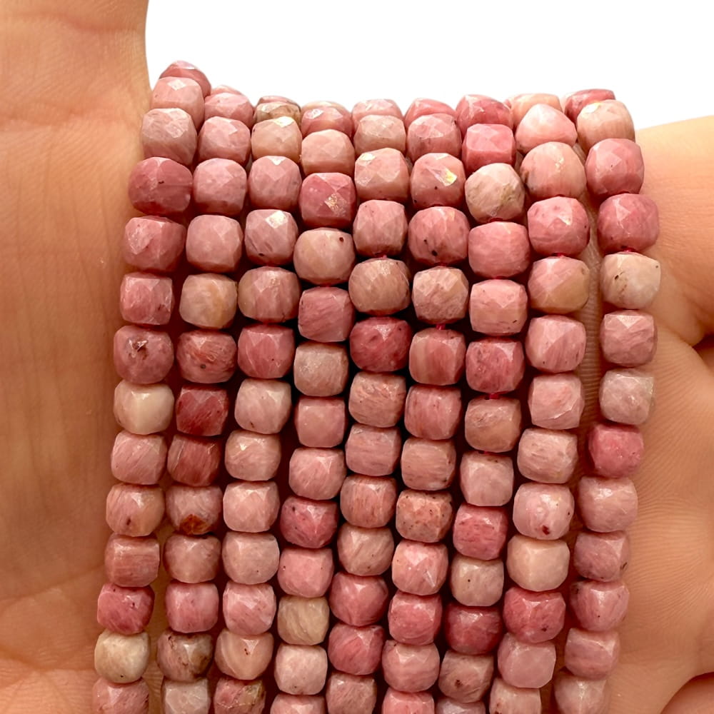 Fasetowane kostki z rodonitu o wymiarach ok. 4x4 mm – kamień o różowej barwie z charakterystycznymi, czarnymi żyłkami. Idealny do biżuterii o harmonijnym, romantycznym i naturalnym charakterze.