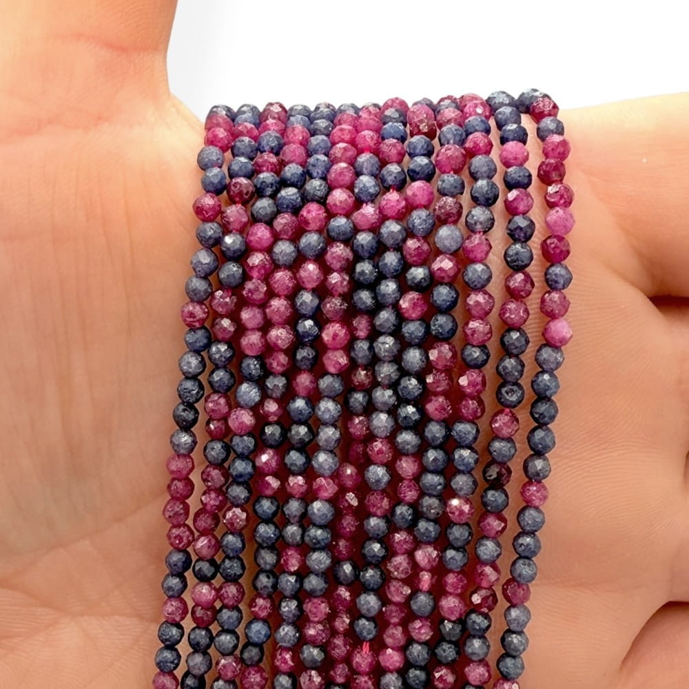 Fasetowane kulki Rubinu z Szafirem o średnicy ok. 2 mm – drobne, naturalne połączenie intensywnych odcieni czerwieni, różu i granatu. Idealne do bardzo delikatnej, minimalistycznej biżuterii i projektów o szlachetnym, energetycznym charakterze.