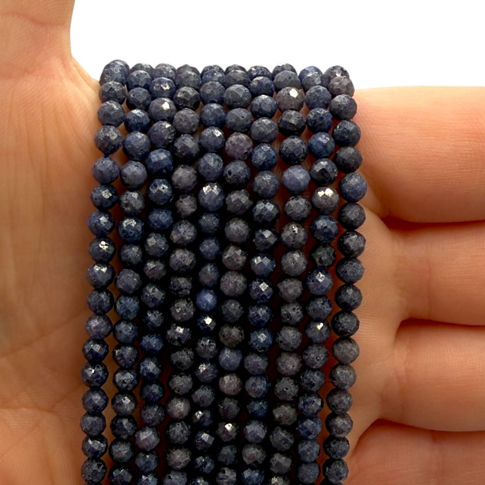 Fasetowane kulki szafiru o średnicy ok. 3 mm – kamień o głębokiej, szlachetnej barwie w odcieniach granatu i ciemnego niebieskiego z naturalnymi przejściami tonalnymi. Szlif fasetowy podkreśla intensywność koloru oraz nadaje koralikom elegancki, luksusowy blask. Idealny do ekskluzywnej biżuterii handmade oraz projektów o prestiżowym charakterze.