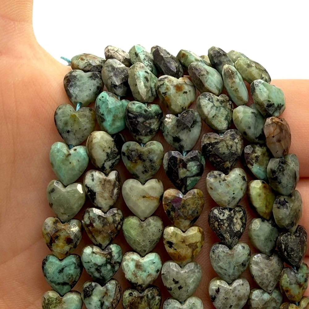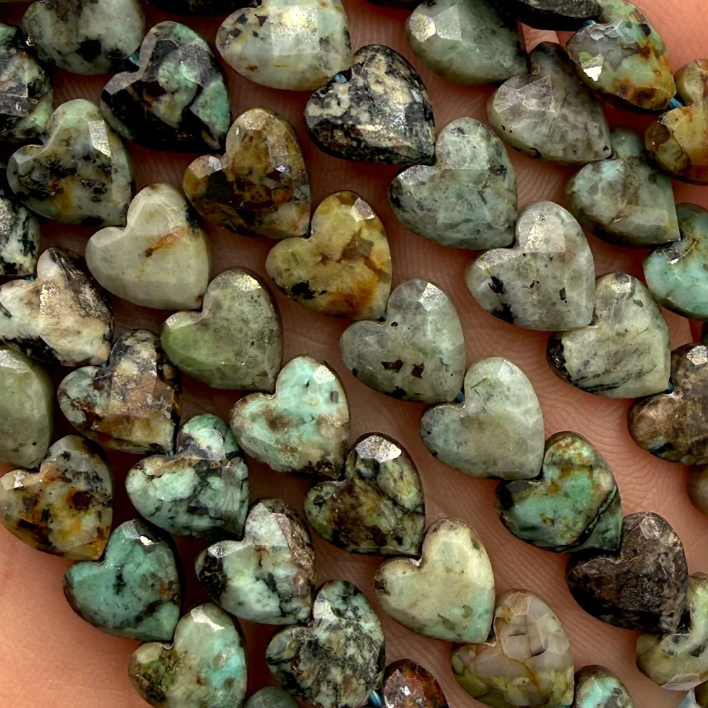 Fasetowane serca turkusu afrykańskiego o wielkości ok. 8 mm – w odcieniach zieleni, turkusu i brązu, z naturalnym, ziemistym rysunkiem. Wyjątkowe i wyraziste, idealne do biżuterii o naturalnym, etnicznym lub eleganckim charakterze.