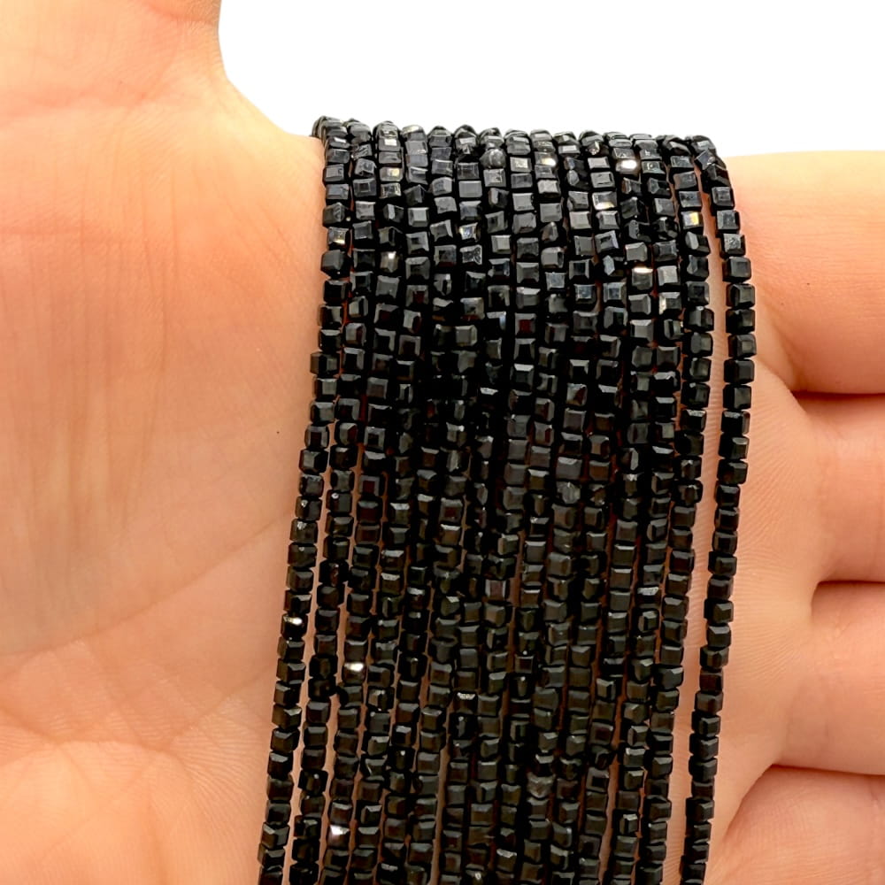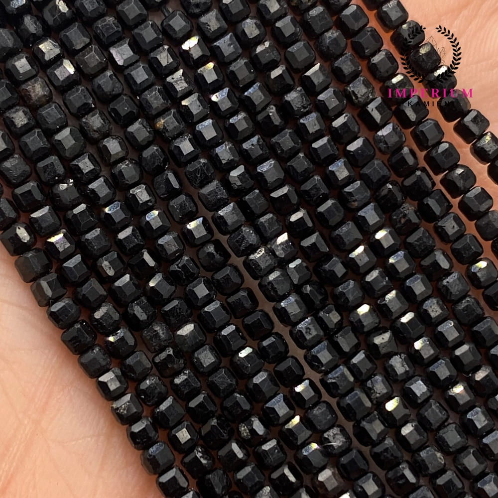 Turmalin Czarny – kostka fasetowana o wymiarach ok. 2x2 mm – głęboko czarny, subtelnie błyszczący kamień, idealny do minimalistycznej i nowoczesnej biżuterii.