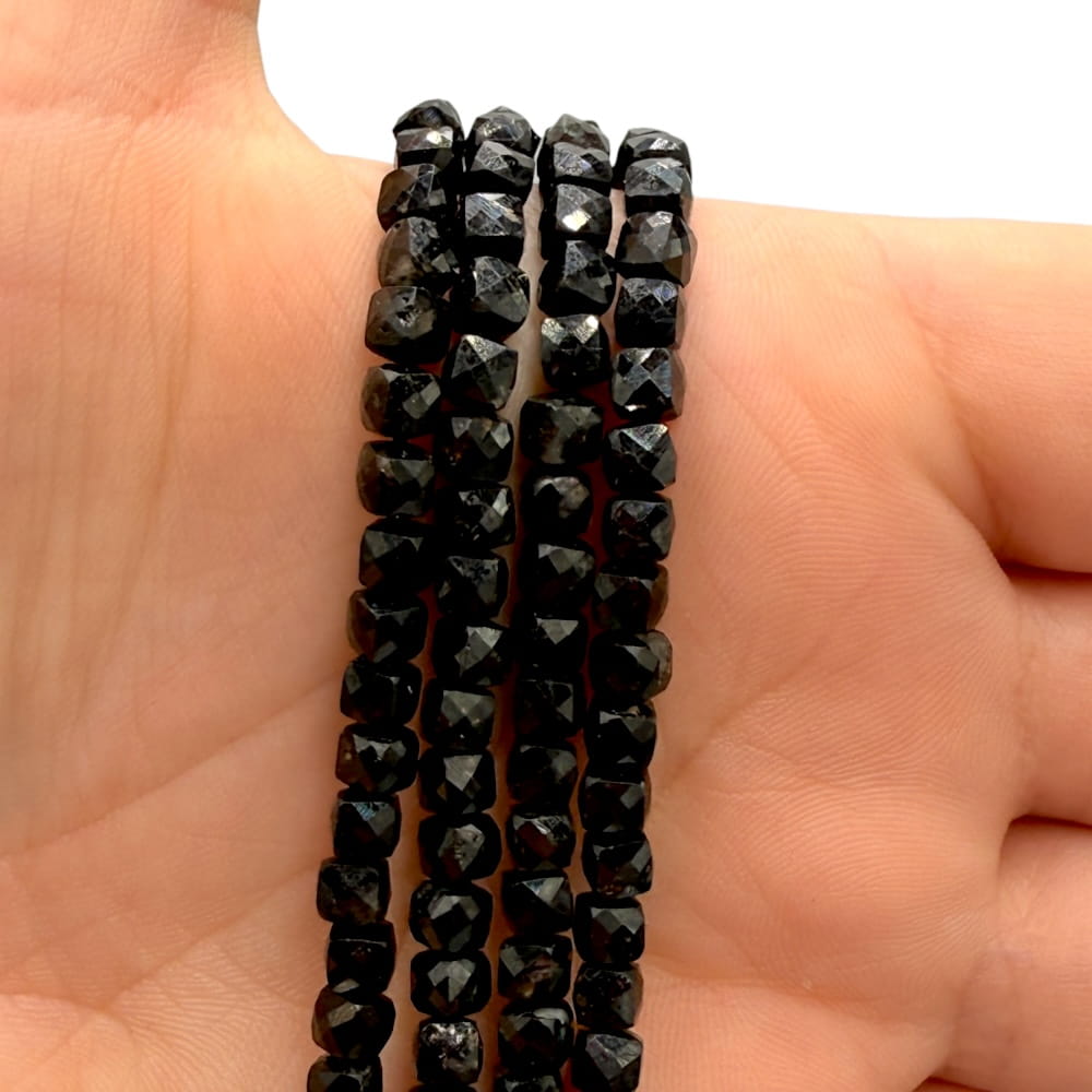 Fasetowane kostki Turmalinu Czarnego o wymiarach ok. 4×4 mm – głęboko czarny kamień o naturalnym połysku. Idealne do biżuterii minimalistycznej, nowoczesnej i projektów o silnym, ochronnym charakterze.