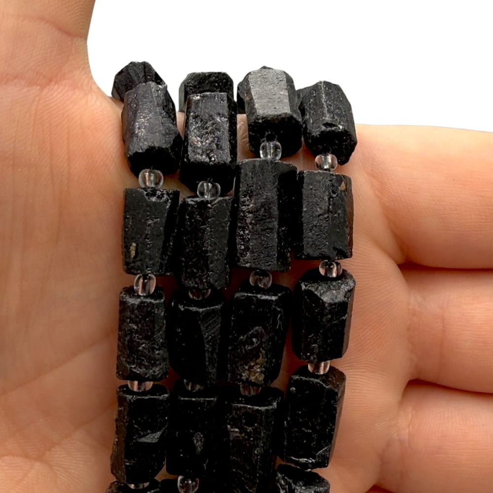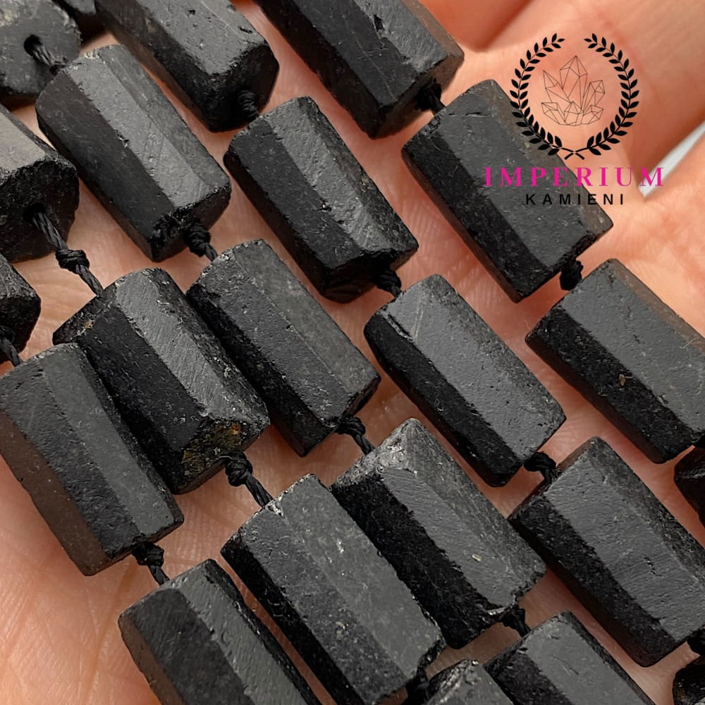 Surowe walce Turmalinu Czarnego o wymiarach ok. 8×12 mm – głęboka, intensywna czerń z naturalną strukturą, idealne do biżuterii ochronnej i energetycznej oraz projektów w nowoczesnym, surowym stylu.