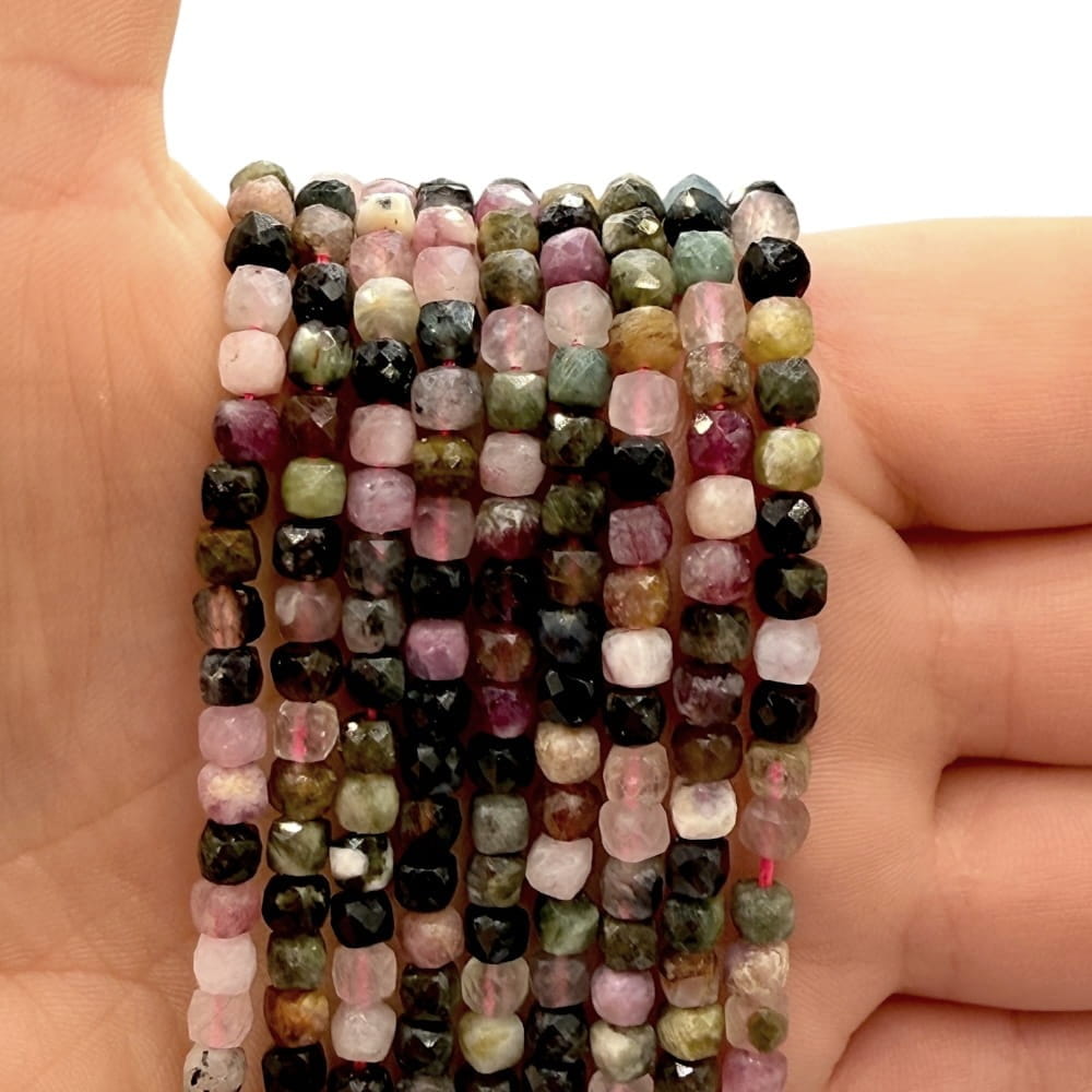 Fasetowane kostki turmalinu mix kolorów o wymiarach ok. 4×4 mm – wielobarwne, eleganckie i pełne naturalnej energii. Idealne do biżuterii żywej, luksusowej i pełnej różnorodności barw.