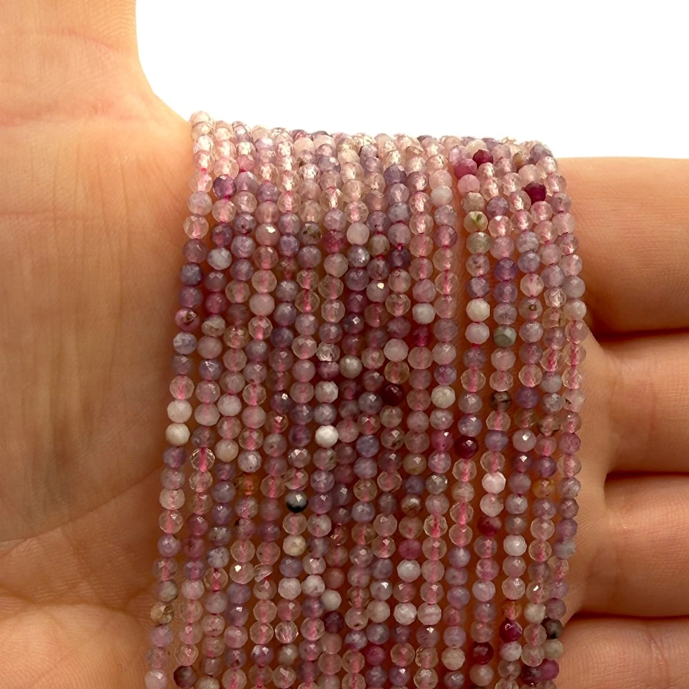 Fasetowane kulki turmalinu śliwkowego o średnicy ok. 2 mm – drobne, eleganckie, o głębokim odcieniu śliwki i subtelnym połysku. Idealne do precyzyjnej, delikatnej biżuterii oraz projektów o wyrafinowanym, kobiecym charakterze.