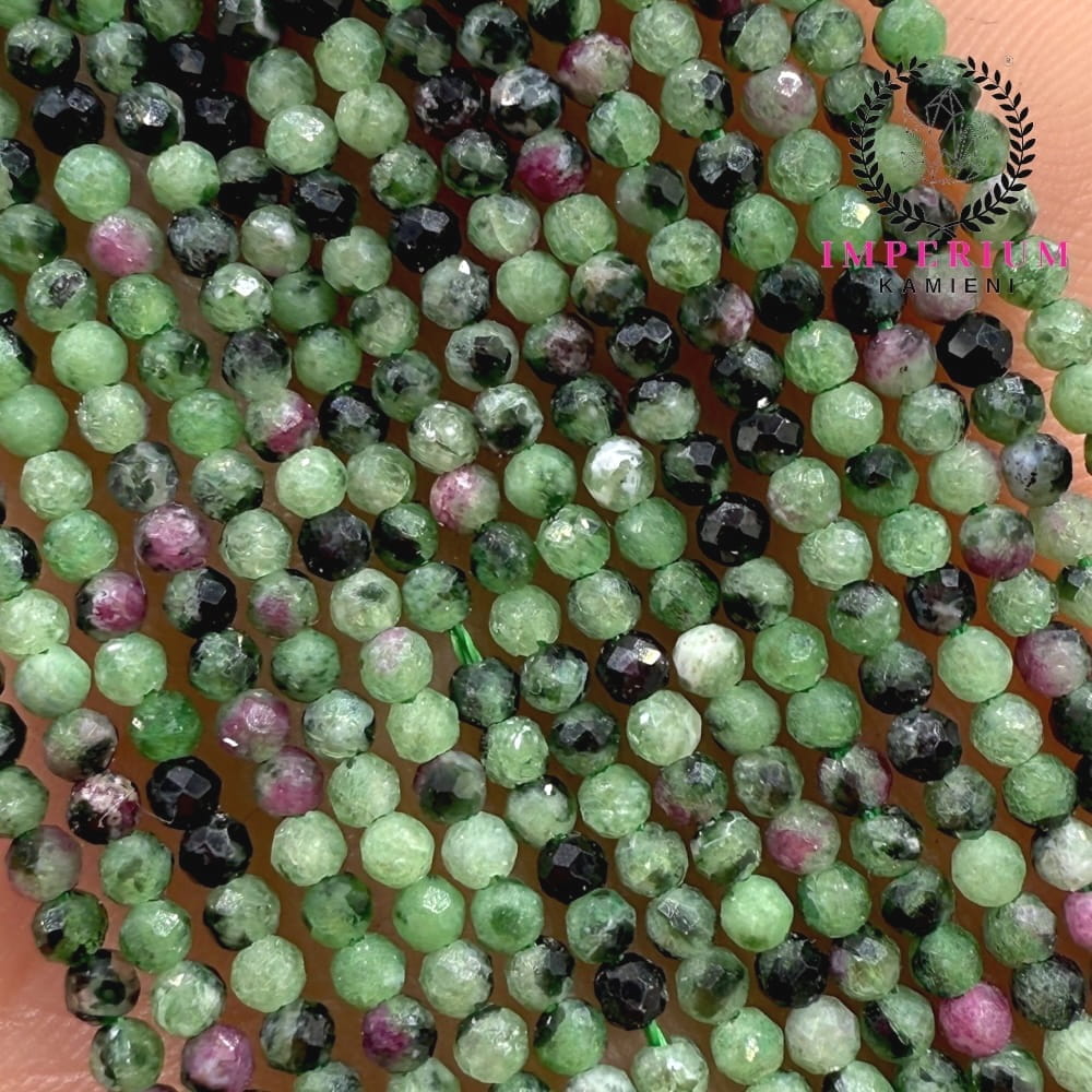 Fasetowane kulki zoisytu z rubinem (anyolit) o średnicy ok. 2 mm – zielone tło zoisytu z czerwonymi inkluzjami rubinu. Idealne do biżuterii minimalistycznej, eleganckiej i projektów o energetycznym, harmonijnym charakterze.