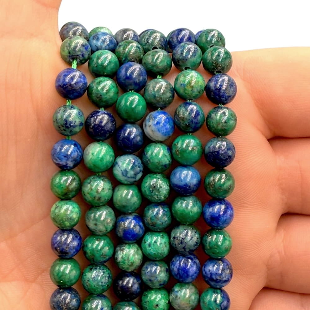 Gładkie kulki azurytu o średnicy ok. 6 mm – kamień o intensywnej, głębokiej niebieskiej barwie z naturalnymi przejściami tonalnymi i charakterystyczną mineralną strukturą. Polerowana powierzchnia podkreśla nasycenie koloru oraz nadaje koralikom elegancki, biżuteryjny połysk. Idealny do wyrazistej, artystycznej biżuterii handmade oraz projektów o mistycznym charakterze.