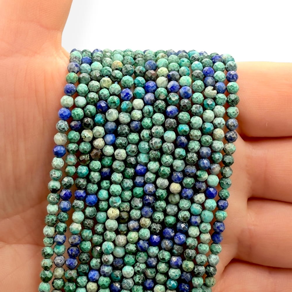 Chryzokola to kamień o pięknych odcieniach zieleni i turkusu, często z drobnymi wrostkami miedzi lub malachitu. Fasetowane kule o średnicy około 3 mm podkreślają naturalną głębię kolorów i dodają kamieniowi subtelnego połysku. Ich lekki rozmiar sprawia, że doskonale nadają się do bransoletek, kolczyków czy jako dekoracyjny akcent w naszyjnikach, wprowadzając do projektów wyjątkową, żywiołową energię.