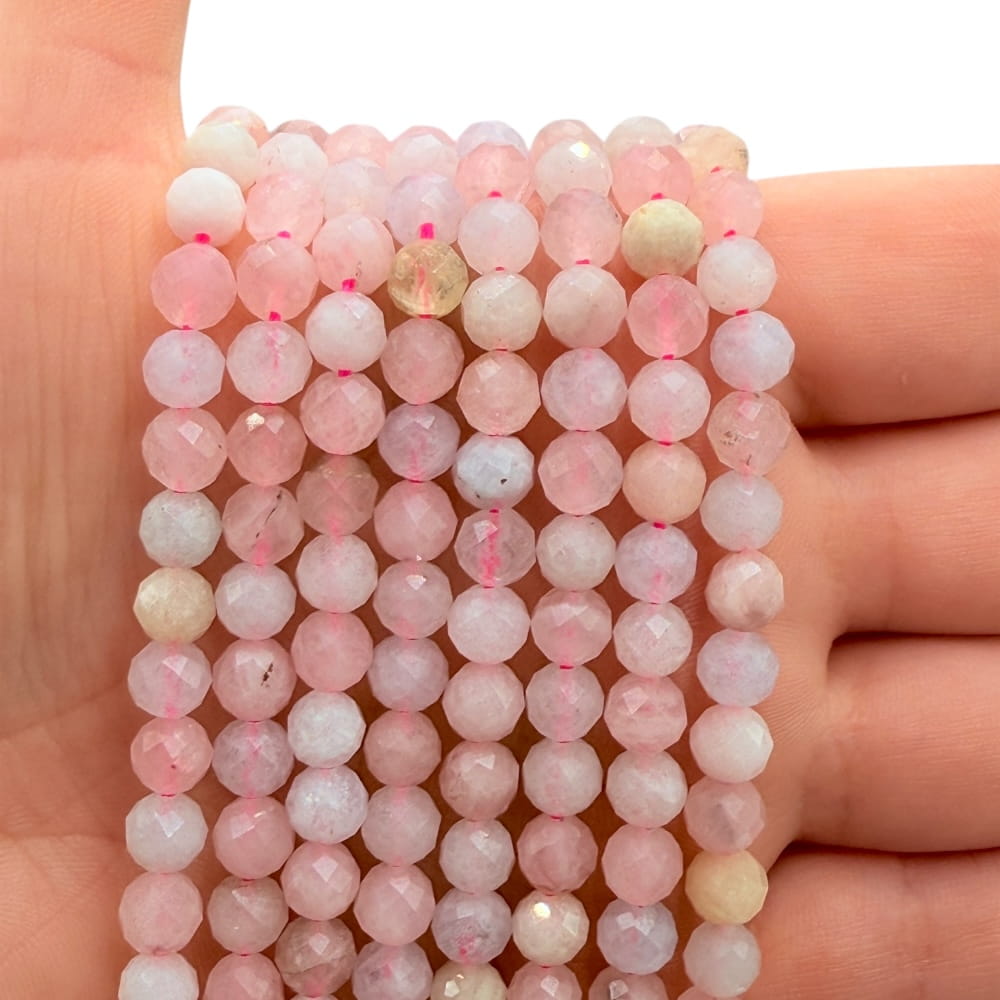 Fasetowane kulki morganitu o średnicy ok. 6 mm – w delikatnych, pastelowych odcieniach różu, brzoskwini i jasnego beżu. Idealne do biżuterii subtelnej, romantycznej i pełnej eleganckiego, naturalnego blasku.