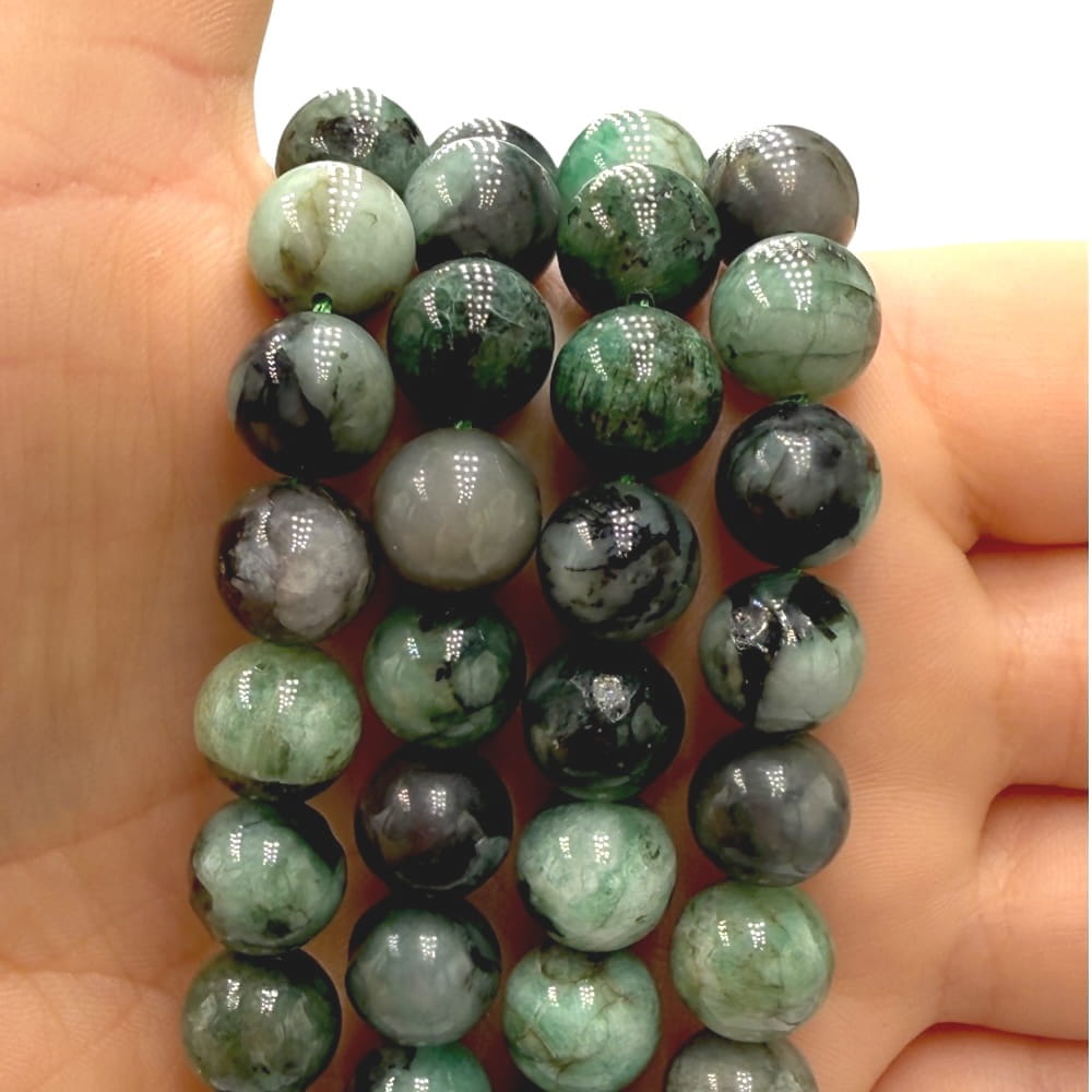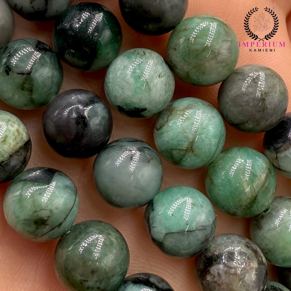 W formie fasetowanych kulek o średnicy ok. 4 mm szmaragd prezentuje się wyjątkowo elegancko. Szlif fasetowy podkreśla jego naturalny blask, wydobywa subtelne refleksy i dodaje głębi unikalnym, zielonym tonom. Każdy sznur jest niepowtarzalny ze względu na wewnętrzne struktury typowe dla tego minerału.